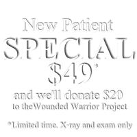 Never been to our office before? Your first visit is only $49 and we'll make a $20 donation to the Wounded Warrior Project too!