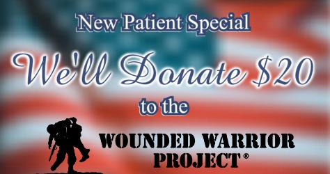 Never been to our office before? Your first visit is only $49 and we'll make a $20 donation to the Wounded Warrior Project too!